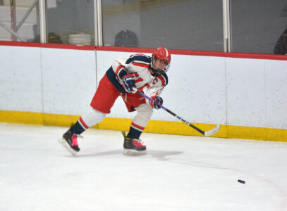 - SLP’s Ethan Knight makes a pass during Saturday’s Lake Placid Winter Carnival championship game against Plattsburgh at the Olympic Center in Lake Placid. (Enterprise photo — Parker O’Brien)