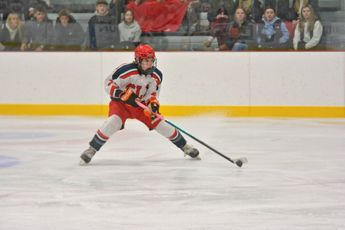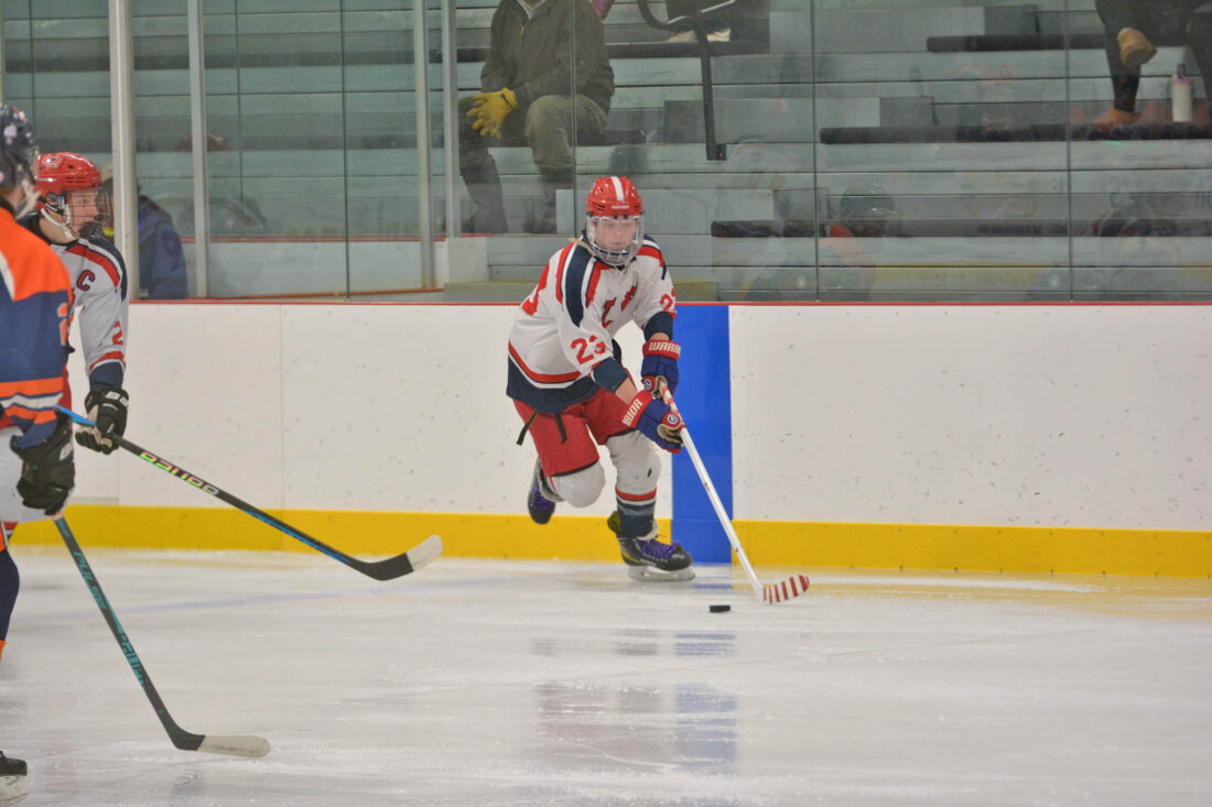 - SLP’s Eli McCormick attempts a breakaway shot during Tuesday’s game against Potsdam at the Saranac Lake Civic Center. (Enterprise photo — Parker O’Brien)