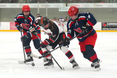 - SLP’s Harper Strack, right, fights for the puck with Beekmantown’s Chloe Campbell during Monday’s Section VII girls hockey championship game at the Plattsburgh State Fieldhouse. Also pictured is SLP’s Maddy Clark. (Provided photo — Joey LaFranca)