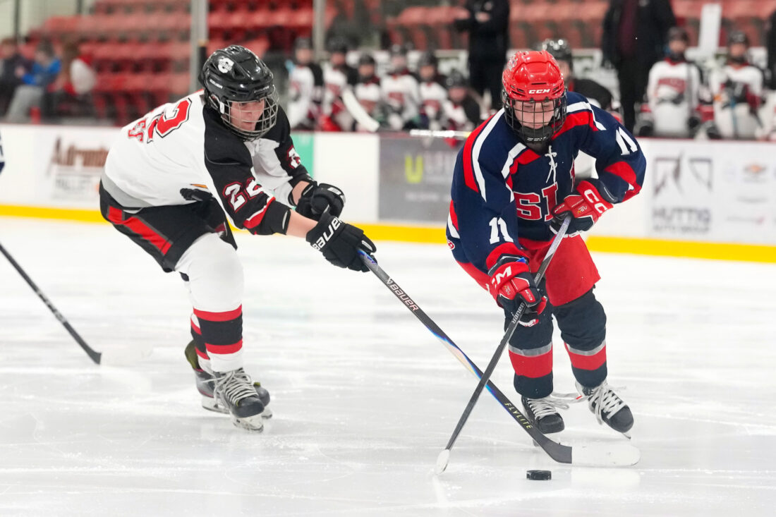 SLP’s Madison Blinn, right, skates with the puck while Beekmantown’s Rhianna Gilligan during Monday’s Section VII girls hockey championship game at the Plattsburgh State Fieldhouse. (Provided photo — Joey LaFranca)