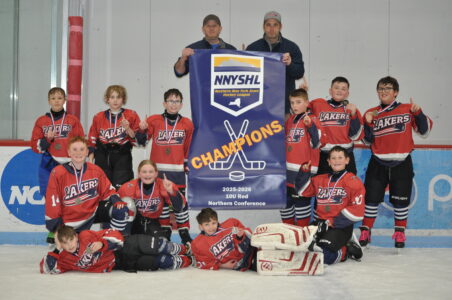 The Sara-Placid 10U Lakers Red battled their whole season to win their league championship on Sunday against Massena Red. Pictured from left, in the first row is Shea Colby and Cole Cassidy. In the the second row are Seth Dearborn, Emma Temple and Wallace Bezio. In the third row are Hollis Hobday, Tyler Bruce, Liam Munn, Tanner Temple, James Nicholas and Jack Farrell. In the back row Coaches Taylor Munn and Tristan Temple. (Provide photo — Lindsay Munn)