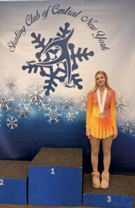 - Pictured is the High Peaks Skating Academy’s Aubrey Bissonette on the podium with her bronze medal in Cicero. (Provided photo)