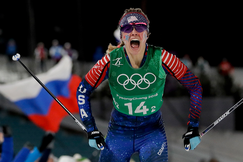 Jessie Diggins celebrates after winning the gold medal in the team sprint freestyle cross-country skiing final Feb. 21 at the 2018 Winter Olympics in Pyeongchang, South Korea.