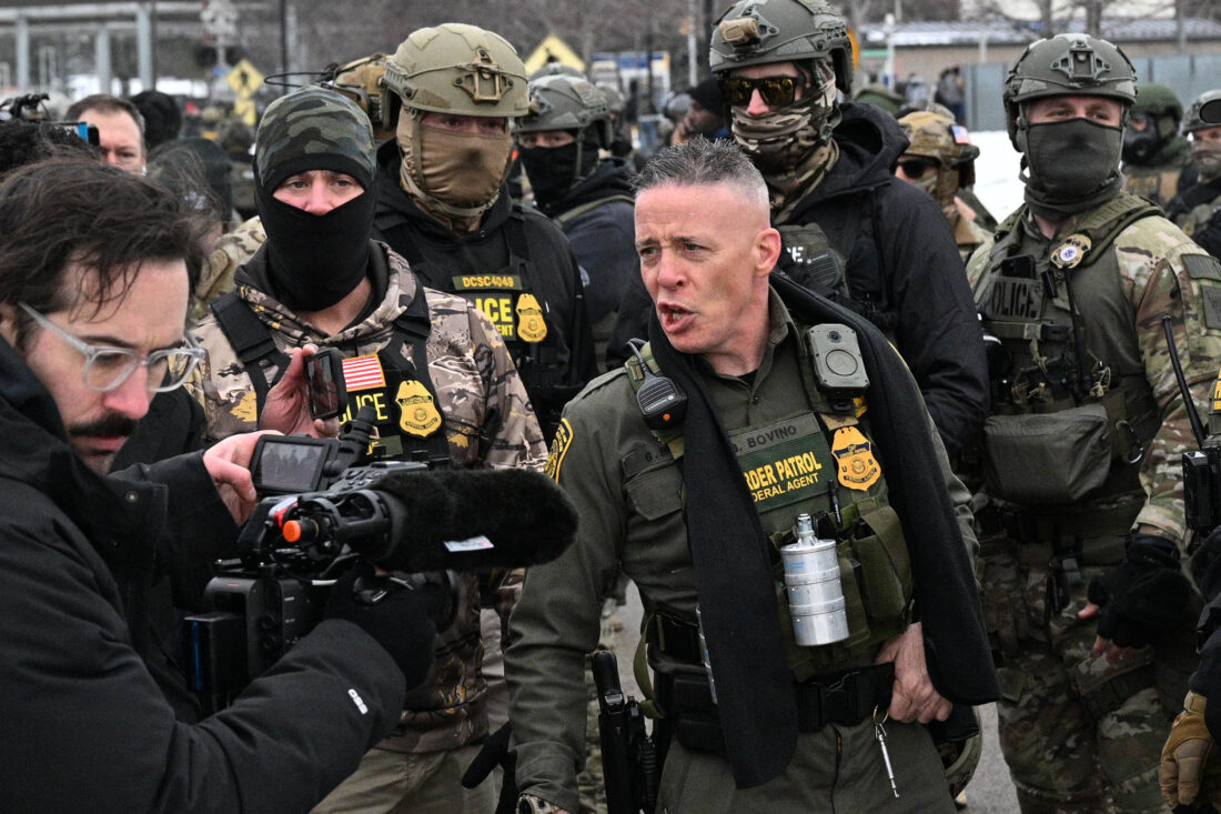 U.S. Border Patrol Cmdr. Gregory Bovino arrives as protesters gather outside the Bishop Henry Whipple Federal Building, Thursday, Jan. 8, in Minneapolis, Minn. (AP photo — Tom Baker)